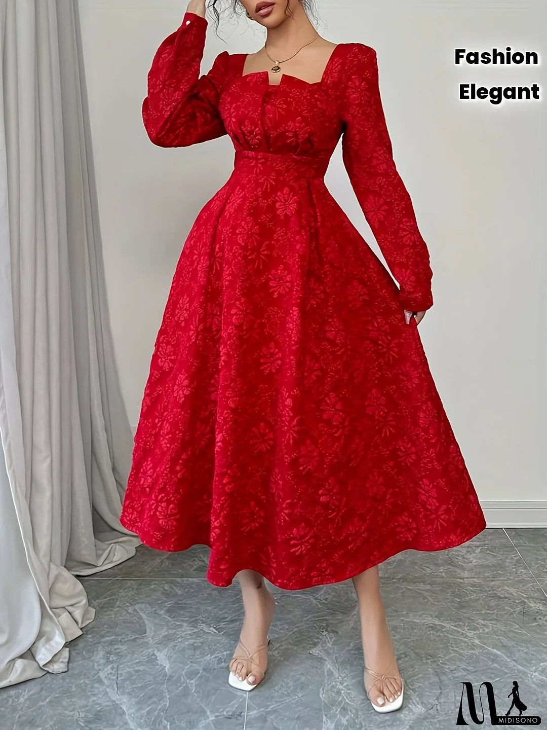 Elegant Vintage Floral Jacquard A-Line Dress For Women - Long Sleeve, Square Neck, Button Detail, Red, Perfect For Spring/Summer, Adult Fashion, Floral Dress